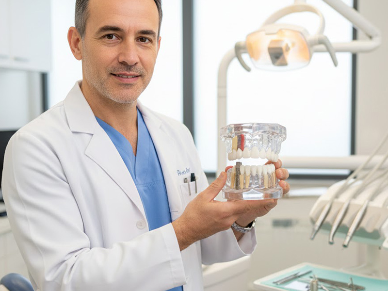 Clinicamente, a mucosite peri-implantar se manifesta por mucosa avermelhada, edemaciada e com sangramento à sondagem, podendo, em alguns casos, apresentar dor ou recessão gengival. A peri-implantite, por sua vez, apresenta inflamação mais intensa, com sangramento, perda da crista óssea alveolar e formação de bolsas peri-implantares iguais ou superiores a 5 mm. Para diagnosticar essas alterações, o dentista realiza um exame clínico minucioso, incluindo sondagem dos tecidos ao redor do implante para identificação de sangramento e profundidade de bolsas. Radiografias periapicais complementam o diagnóstico, permitindo avaliar a perda óssea.